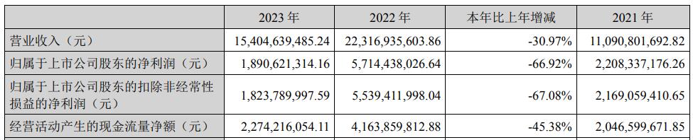2023年,天赐材料实现营业收入154.05亿元,同比下降30.97%;归属于上市公司股东的净利润18.91亿元,同比下降66.92%;归属于上市公司股东的扣除非经常性损益的净利润18.24亿元,同比下降67.08%;经营活动产生的现金流量净额为22.74亿元,同比下降45.38%。
