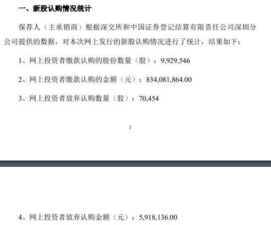 中国网财经7月8日讯 同宇新材日前发布的公告显示,网上投资者缴款认购的股份数量为9,929,546股,认购金额为834,081,864元;弃购数量为70,454股,弃购金额为5,918,136元。