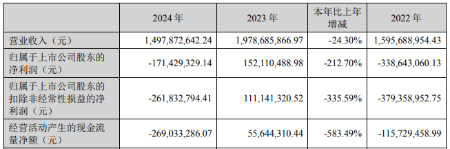 2024年,公司营业收入14.98亿元,同比减少24.30%;归属于上市公司股东的净利润-1.71亿元,上年同期为1.52亿元;归属于上市公司股东的扣除非经常性损益的净利润-2.62亿元,上年同期为1.11亿元;经营活动产生的现金流量净额-2.69亿元,上年同期为5564.43万元。