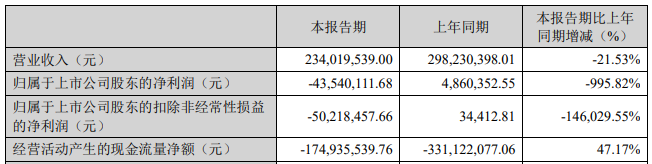 2025年一季度,公司营业收入2.34亿元,同比减少21.53%;归属于上市公司股东的净利润-4354.01万元,上年同期为486.04万元;归属于上市公司股东的扣除非经常性损益的净利润-5021.85万元,上年同期为3.44万元;经营活动产生的现金流量净额-1.75亿元,上年同期为-3.31亿元。