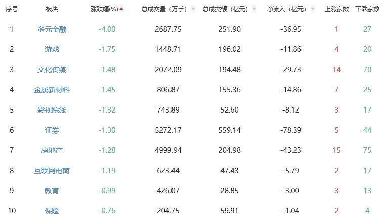 板块方面,贵金属、能源金属、造纸等涨幅居前,多元金融、游戏、文化传媒等跌幅居前。