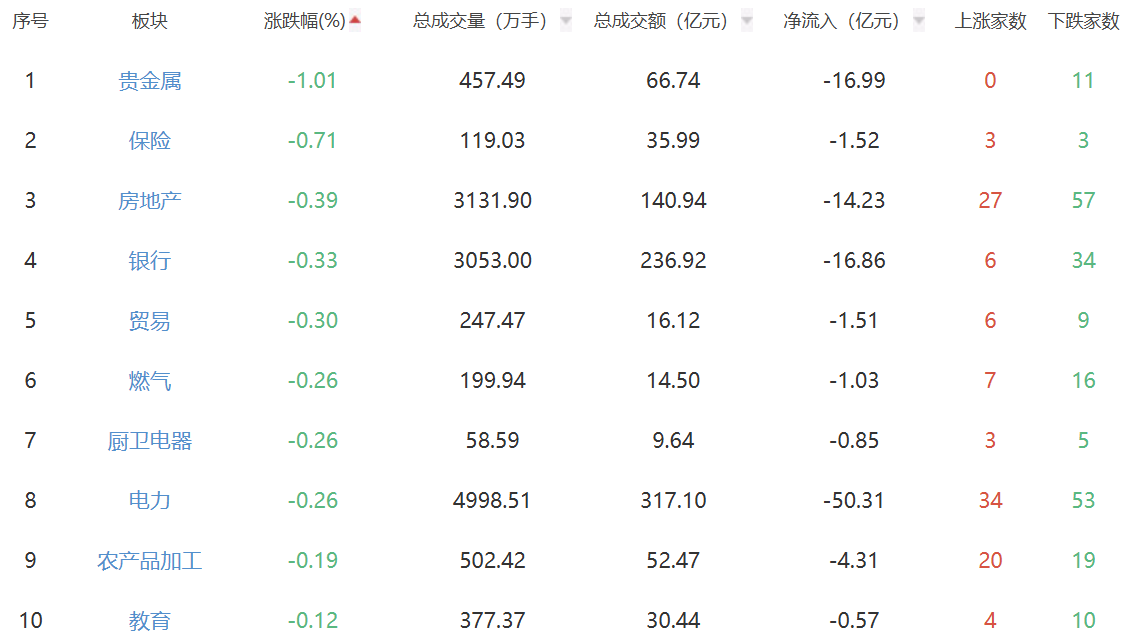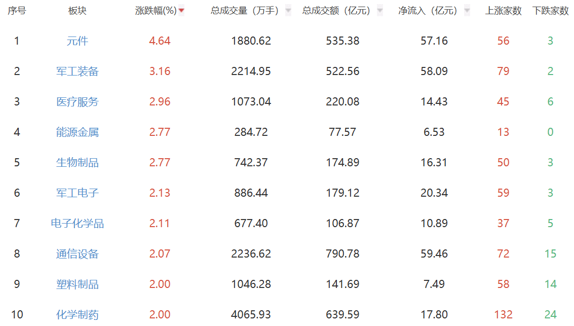 板块方面,元件、军工装备、医疗服务等板块涨幅居前,贵金属、保险、房地产等板块跌幅居前。