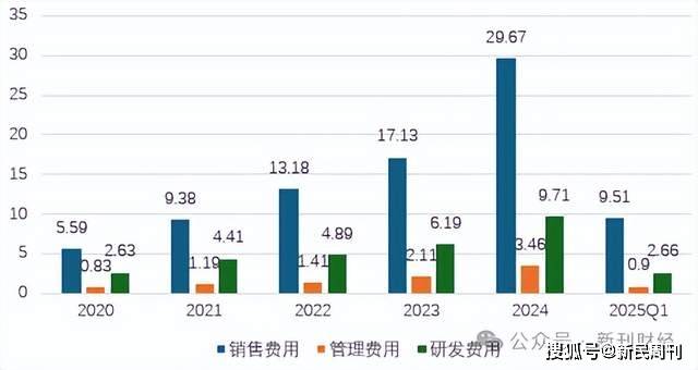 销售费用的持续攀升可能是石头科技“增收不增利”现象的核心动因。2024年,公司销售费用高达29.67亿元,同比大幅增长73.20%,其增速显著高于营收增速。2025年第一季度,这一趋势仍在延续,销售费用同比激增169.25%至9.51亿元,成为影响盈利的主要因素。另外,管理费用增势亦较为明显,2024年达3.46亿元,同比增长63.83%,四年累计增长315.69%。