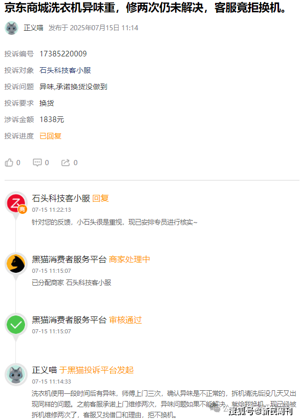 此外,黑猫投诉平台显示,对石头科技的累计投诉已超过1600条,其中不乏对各类产品的商品质量及销售服务的投诉。7月15日有一名消费者反映,“京东商城洗衣机异味重,修两次仍未解决,客服竟拒换机”。