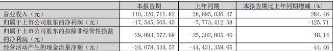 据公司2025年一季报,报告期内,公司实现营业收入1.10亿元,同比增长284.46%;归属于上市公司股东的净利润-1754.55万元,上年同期-777.34万元;扣除非经常性损益后的净利润-2989.36万元,上年同期-2530.28万元;经营活动产生的现金流量净额-2467.85万元。