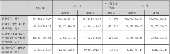 据公司2024年年报,报告期内,公司实现营业收入3.45亿元,同比减少37.60%;归属于上市公司股东的净利润-2954.97万元,同比减少171.72%;扣除非经常性损益后的净利润-1.16亿元,同比减少1704.76%;经营活动产生的现金流量净额-3357.52万元。