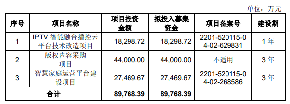 多彩新媒原拟募集资金89,768.39万元,分别用于IPTV智能融合播控云平台技术改造项目、版权内容采购项目、智慧家庭运营平台建设项目。