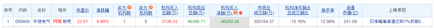 龙虎榜数据显示,买入许继电气金额最大的前5名中,1家为机构专用席位;卖出许继电气金额最大的前5名中,5家为机构专用席位。经统计,机构席位今日卖出许继电气净额为46250.38万元。