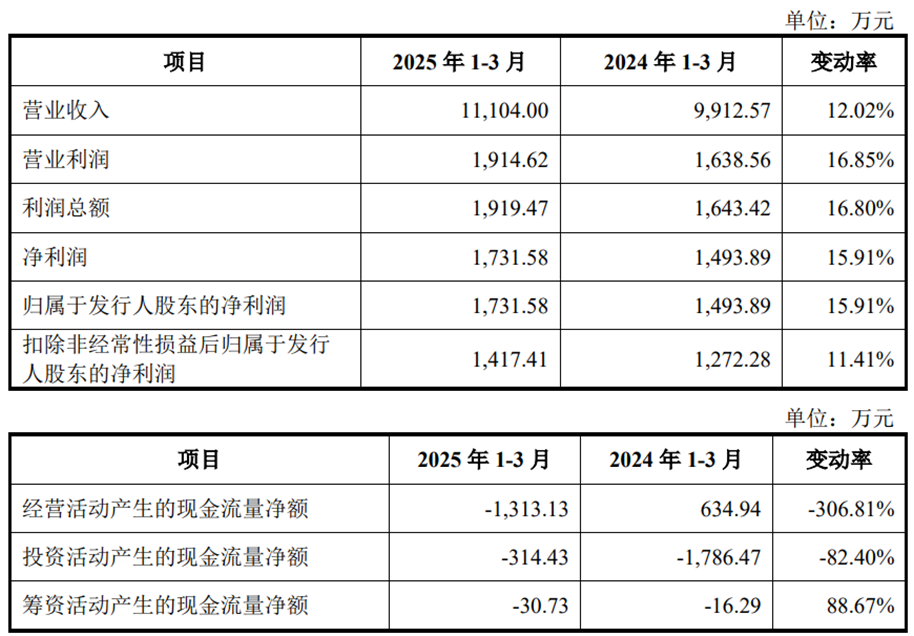 2025年1-3月,山大电力的营业收入为11,104.00万元,同比增长12.02%;净利润/归属于发行人股东的净利润为1,731.58万元,同比增长15.91%;扣除非经常性损益后归属于发行人股东的净利润为1,417.41万元,同比增长11.41%;经营活动产生的现金流量净额为-1,313.13万元。