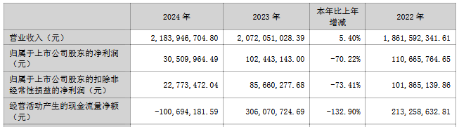 2022年至2024年,公司营业收入分别为18.62亿元、20.72亿元、21.84亿元,归属于上市公司股东的净利润分别为1.11亿元、1.02亿元、3,051.00万元,归属于上市公司股东的扣除非经常性损益的净利润分别为1.02亿元、8,566.03万元、2,277.35万元,经营活动产生的现金流量净额分别为2.13亿元、3.06亿元、-1.01亿元。
