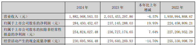 2024年,元力股份营业收入为18.83亿元,同比下降6.57%;归属于上市公司股东的净利润2.84亿元,同比增长19.95%;归属于上市公司股东的扣除非经常性损益的净利润2.55亿元,同比增长7.64%;经营活动产生的现金流量净额2.31亿元,同比下降14.76%。