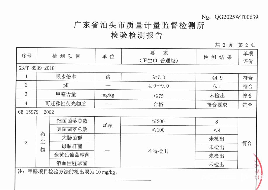 辛选集团提供了20份棉密码卫生巾的检测检验报告,检测机构均为广东省汕头市质量计量监督检测所,检测结果均显示,所检项目符合GB/T 8939-2018《护垫》和GB/T 15979-2002《一次性使用卫生用品卫生标准》,检测的项目为吸水倍率、pH、甲醛含量、可迁移性荧光物质和微生物。