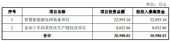 科润智控2025年4月1日披露的向特定对象发行股票募集说明书(修订稿) 显示,本次发行的募集资金总额不超过30,988.02万元(含本数),扣除发行费用后,拟全部用于智慧新能源电网装备项目和金加工车间柔性化生产线技改项目。