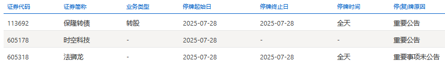 中国经济网北京7月28日讯 上交所网站显示,法狮龙(605318.SH)今日全天停牌,停牌原因为重要事项未公告。