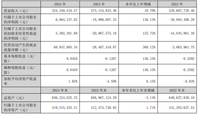 去年,公司实现营业收入3.24亿元,同比增长18.70%;归属于上市公司股东的净利润686.42万元,去年同期为-1899.87万元;归属于上市公司股东的扣除非经常性损益的净利润539.23万元,去年同期为-2096.76万元;经营活动产生的现金流量净额6884.77万元。