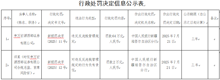 中国经济网北京7月28日讯 中国人民银行新疆维吾尔自治区分行网站今日公布的行政处罚决定信息公开表(新银罚决字〔2025〕11号、12号)显示,申万宏源西部证券有限公司违反反洗钱管理规定。中国人民银行新疆维吾尔自治区分行对该公司罚款64万元人民币。