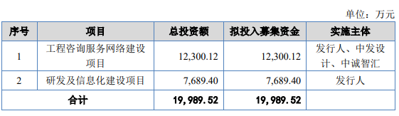 中诚咨询本次在北交所拟募集资金19,989.52万元,用于工程咨询服务网络建设项目、研发及信息化建设项目。