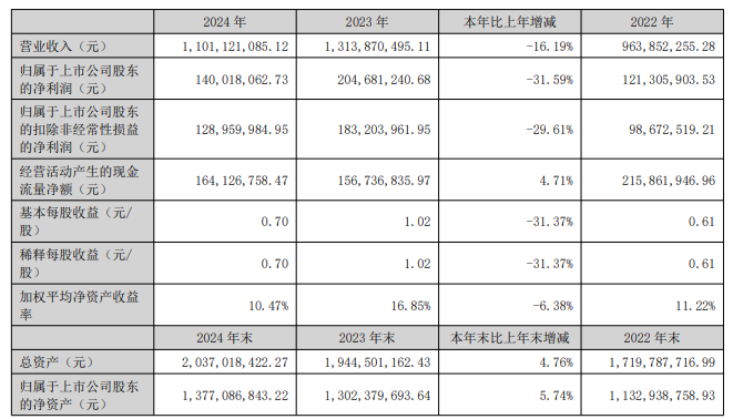 壶化股份2024年年度报告显示,去年,公司实现营业收入11.01亿元,同比减少16.19%;归属于上市公司股东的净利润1.40亿元,同比减少31.59%;归属于上市公司股东的扣除非经常性损益的净利润1.29亿元,同比减少29.61%;经营活动产生的现金流量净额1.64亿元。