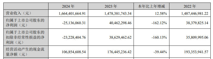 2024年,祖名股份实现营业总收入16.64亿元,同比增长12.58%;归母净利润-2513.61万元,上年同期4046.23万元;扣非净利润-2322.84万元,上年同期3862.95万元;经营活动产生的现金流量净额为1.07亿元,同比下降39.44%。