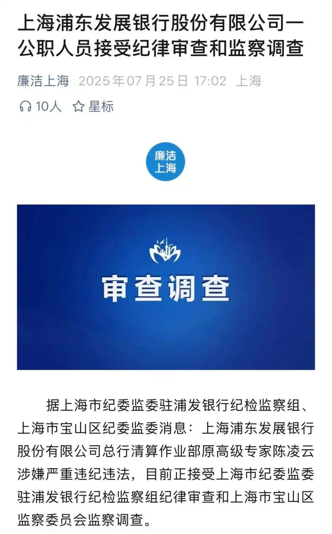 “高级专家”也不是安全港湾。7月25日,上海市纪委监委驻浦发银行纪检监察组、上海市宝山区纪委监委消息:上海浦东发展银行总行清算作业部原高级专家陈凌云涉嫌严重违纪违法,目前正接受纪律审查和监察调查。从公开履历看,陈凌云曾在2017年升任合肥分行行长,2020年又转战长沙分行当一把手,2022年6月被调回总行担任清算作业部高级专家。