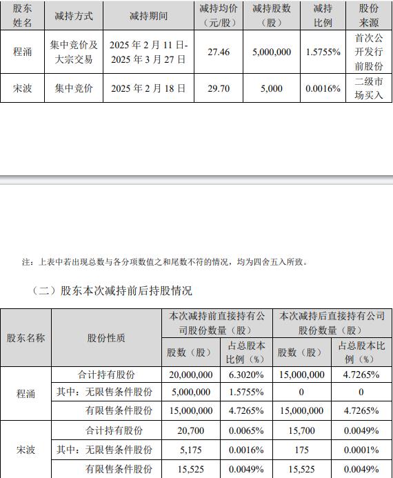 公司3月29日披露关于公司股东减持计划期限届满的公告,程涌自2025年2月11日至2025年3月27日以集中竞价及大宗交易方式减持5,000,000股,减持比例1.5755%,减持均价27.46元/股,股份来源为首次公开发行前股份;宋波2025年2月18日以集中竞价方式减持5,000股,减持比例0.0016%,减持均价29.70元/股,股份来源为二级市场买入。公司表示,本次减持已按照相关规定进行了预先披露,减持的实施情况与此前已披露的意向、承诺及减持计划一致,不存在违反承诺的情形。本次减持计划的实施不会导致公司控制权发生变更,不会对公司治理结构及持续经营产生影响。