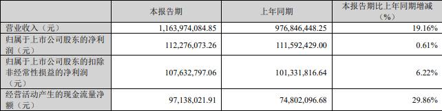 据公司2025年一季度报告,报告期内,公司实现营业收入11.64亿元,同比增长19.16%;归属于上市公司股东的净利润1.12亿元,同比增长0.61%;扣除非经常性损益后的净利润1.08亿元,同比增长6.22%;经营活动产生的现金流量净额9713.80万元,同比增长29.86%。