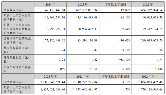 2024年,公司实现营业收入5.47亿元,同比下滑12.07%;归属于上市公司股东的净利润1946.48万元,同比下滑83.10%;归属于上市公司股东的扣非净利润-679.37万元,同比下滑107.64%;经营活动产生的现金流量净额为7512.04万元。
