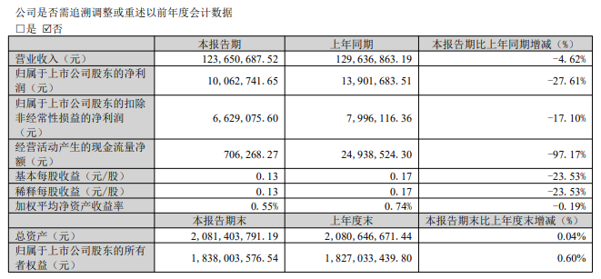 2025年一季度,公司营业收入为1.24亿元,同比下滑4.62%;归属于上市公司股东的净利润为1006.27万元,同比下滑27.61%;归属于上市公司股东的扣非归母净利润为662.91万元,同比下滑17.10%;经营现金流净额为70.63万元。