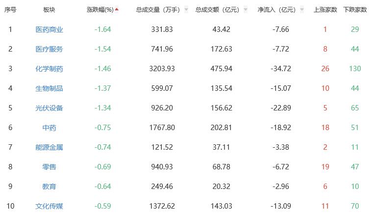 板块方面,军工装备、军工电子、贵金属等涨幅居前,医药商业、医疗服务、化学制药等跌幅居前。