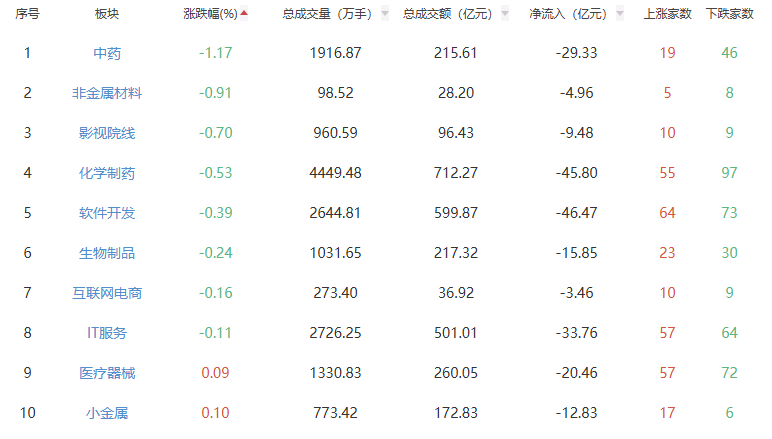 板块方面,通信设备、消费电子、小家电等板块涨幅居前,中药、非金属材料、影视院线等板块跌幅居前。