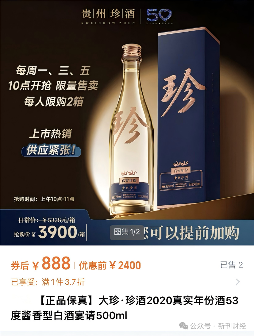 这款标价888元的大珍·珍酒,在电商平台被消费者拿来对标茅台1935。值得注意的是,其在电商平台宣传页面直接标注“上市热销”、“供应紧张”等字眼,并设置每周三次的固定抢购时段,每人限购两箱,营销噱头十足。然而,现实情况却颇具讽刺意味,天猫珍酒酒类旗舰店销售数据显示,该产品的实际销量仅有2件,所谓的热销似乎更像是一场精心策划的营销表演。