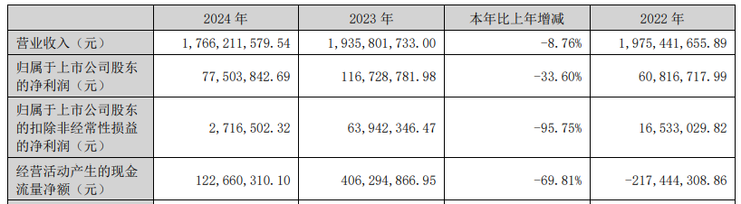 2024年,天阳科技实现营业收入17.66亿元,同比下降8.76%;归属于上市公司股东的净利润为7750.38万元,同比下降33.60%,归属于上市公司股东的扣非净利润为271.65万元,同比下降95.75%。