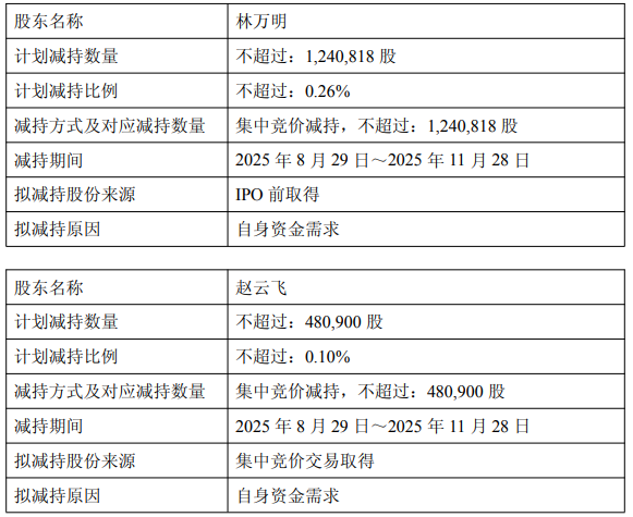 因自身资金需求,林万明拟通过集中竞价交易方式减持其持有的公司股份不超过1,240,818股,即不超过公司总股本的0.26%;赵云飞拟通过集中竞价交易方式减持其持有的公司股份不超过480,900股,即不超过公司总股本的0.10%。本次减持价格将按照减持实施时的市场价格确定,减持期间为自本公告披露之日起15个交易日后的3个月内(根据中国证券监督管理委员会及上海证券交易所相关规定禁止减持的期间除外)。