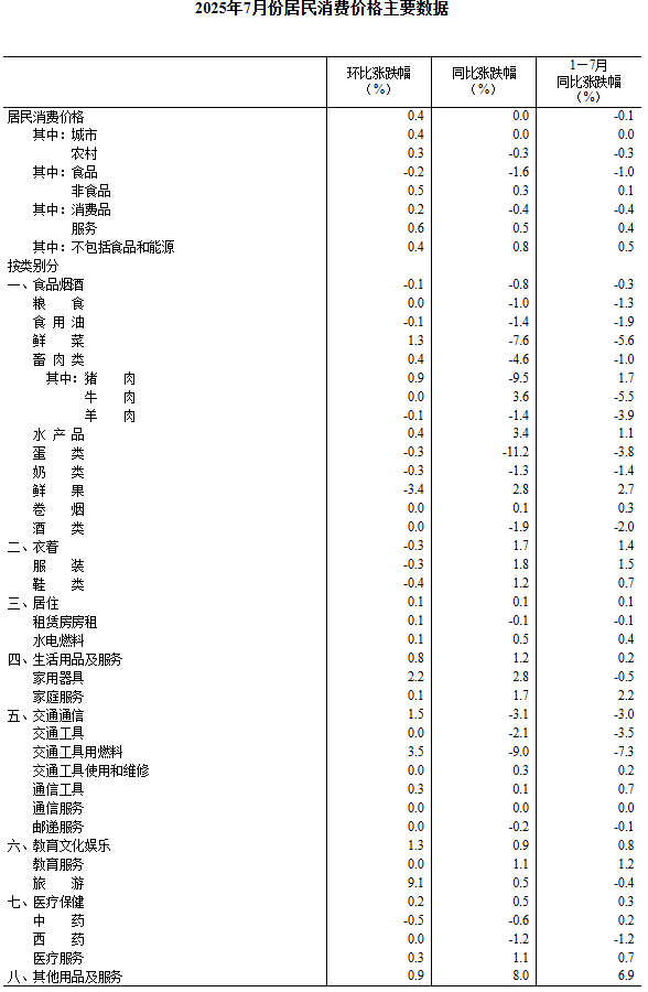 中国经济网北京8月9日讯 据国家统计局网站今日消息,2025年7月份,全国居民消费价格同比持平。其中,城市持平,农村下降0.3%;食品价格下降1.6%,非食品价格上涨0.3%;消费品价格下降0.4%,服务价格上涨0.5%。1—7月平均,全国居民消费价格比上年同期下降0.1%。