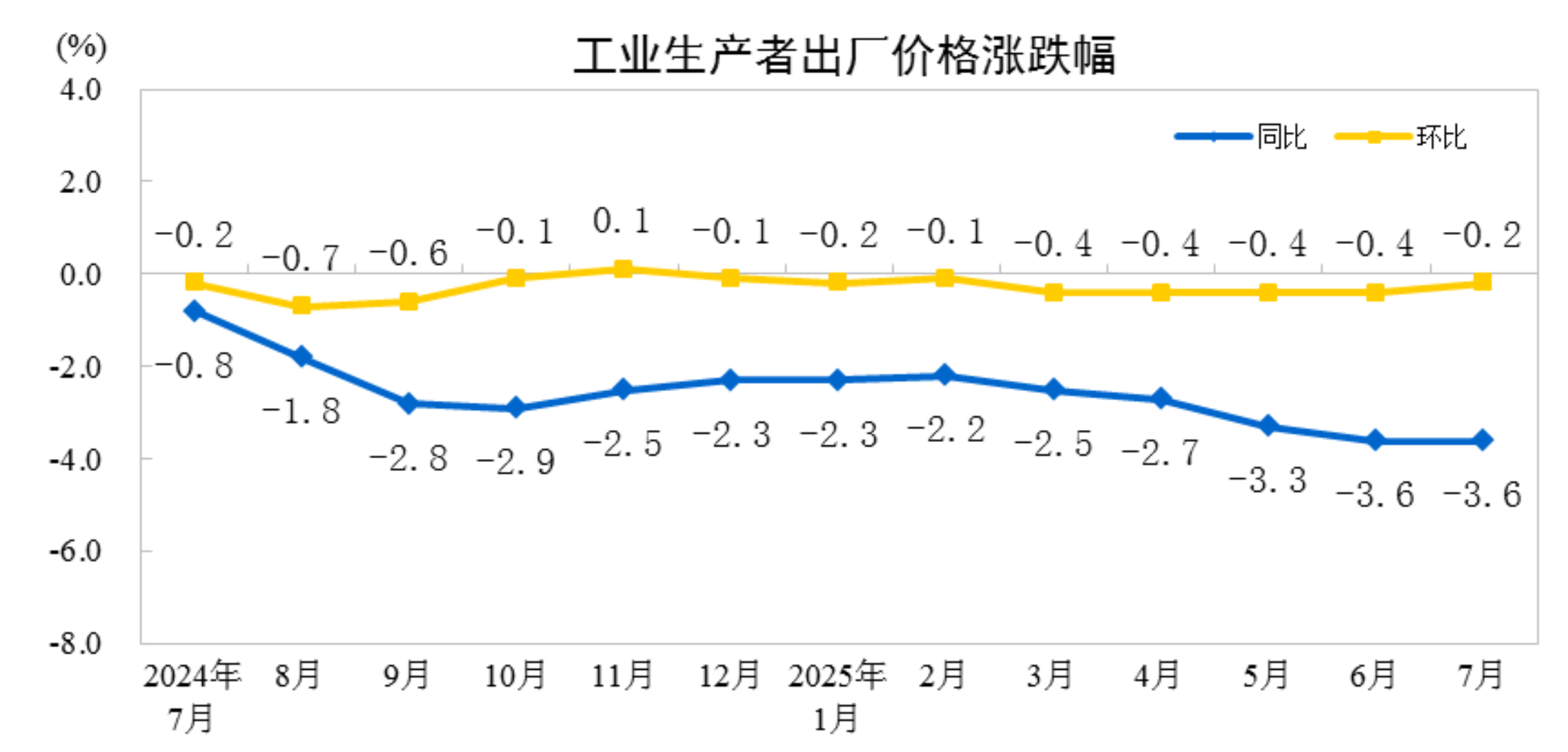 中国经济网北京8月9日讯 据国家统计局网站今日消息,2025年7月份,全国工业生产者出厂价格环比下降0.2%,工业生产者购进价格环比下降0.3%,降幅比上月分别收窄0.2个和0.4个百分点。工业生产者出厂价格同比下降3.6%,工业生产者购进价格同比下降4.5%。1—7月平均,工业生产者出厂价格比上年同期下降2.9%,工业生产者购进价格下降3.2%。