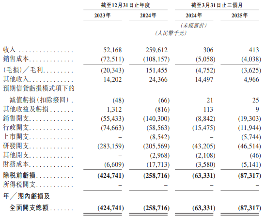 2023年、2024年、2025年1-3月,中慧生物的收入分别为人民币52.2百万元、人民币259.6百万元、人民币0.4百万元;亏损及全面开支总额分别为人民币424.7百万元、人民币258.7百万元、人民币87.3百万元。