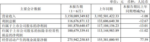 据公司2025年半年报,报告期内,公司实现营业收入31.58亿元,同比减少1.08%;归属于上市公司股东的净利润1.02亿元,同比减少13.01%;扣除非经常性损益后的净利润1.01亿元,同比减少11.02%;经营活动产生的现金流量净额2.76亿元,同比增长77.59%。
