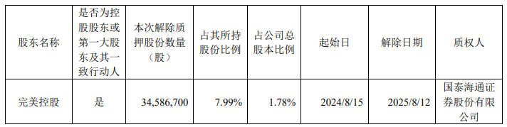 完美控股将其持有的完美世界3458.6700万股股份进行解除质押,本次解除质押股份数量占其所持股份比例为7.99%,占公司总股本比例1.78%。