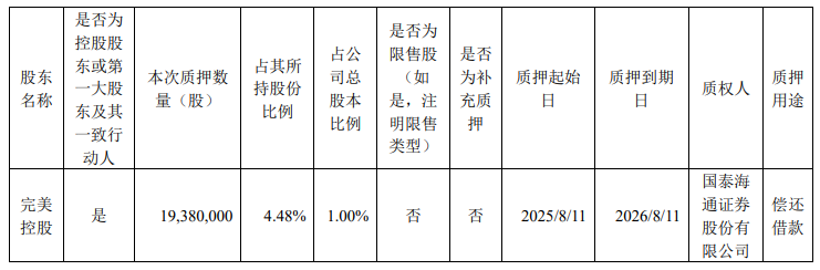 完美控股将其持有的完美世界1938.00万股股份进行质押,质押用途为偿还贷款,本次质押股份数量占其所持股份比例为4.48%,占公司总股本比例1.00%。