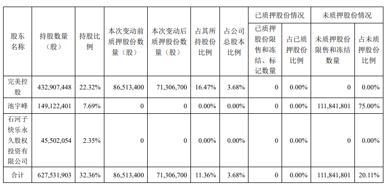 完美控股持有完美世界4.33亿股股份,持股比例22.32%。本次股票质押及解除质押后,完美控股累计质押完美世界股份7130.67万股,占其持股比例的16.47%,占公司总股本比例3.68%。
