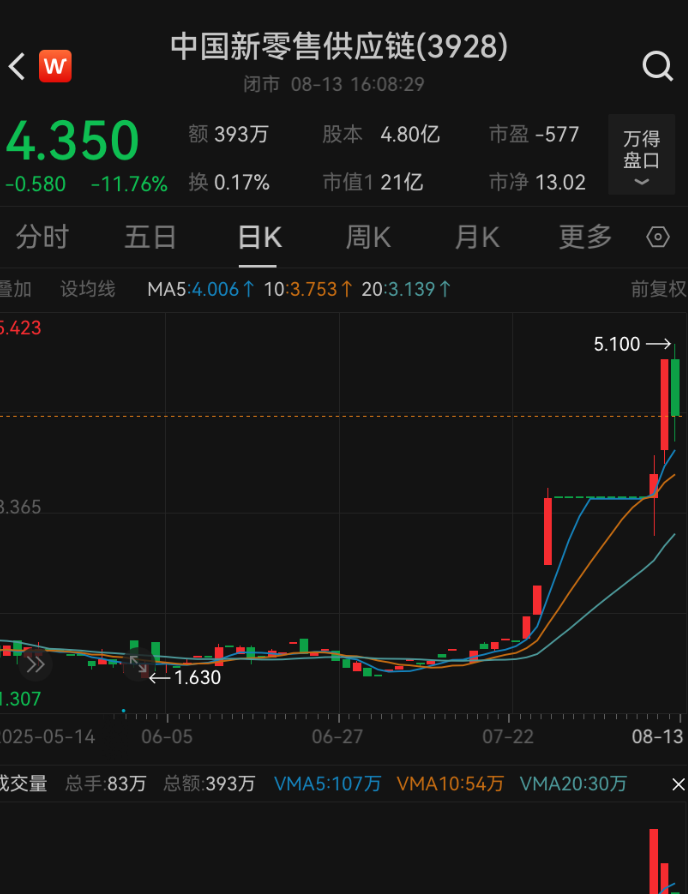 而最近几个交易日中国新零售供应链股价曾连续大涨,截至目前公司的总市值为21亿港元。
