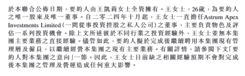 王凯莉,现年26岁,为万疆资本的唯一股东及唯一董事。自2024年10月起,王凯莉一直担任Astrum Apex Investments Limited(一间从事投资控股之私人公司)的董事,主要负责物色及评估投资机会。