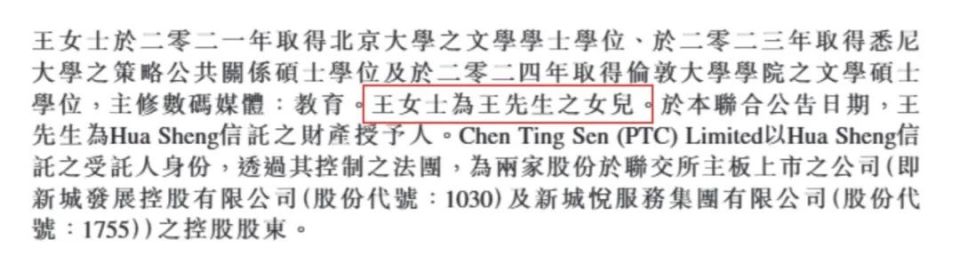 王凯莉的父亲王振华,是两家香港上市公司新城发展、新城悦服务的控股股东。