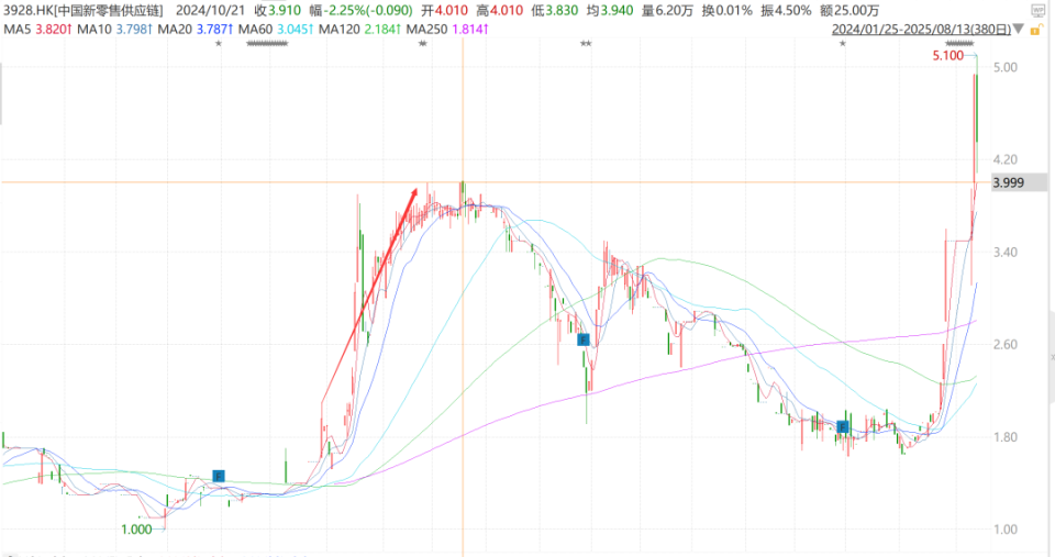 复牌后,公司股价大涨,一度涨近4港元/股。随后在四季度出现调整,2025年1月,S&T HLDGS正式更名为中国新零售供应链,又引发一波上涨,随后股价一度跌至1.6港元/股附近。
