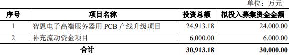 本次发行募集资金不超过30,000万元(含本数),扣除发行费用后将全部用于智恩电子高端服务器用PCB产线升级项目、补充流动资金项目。