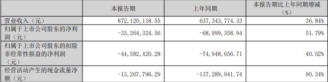 据公司2025年一季报,报告期内,公司实现营业收入8.72亿元,同比增长36.84%;归属于上市公司股东的净利润-3326.43万元,上年同期-6899.94万元;扣除非经常性损益后的净利润-4458.24万元,上年同期-7494.87万元;经营活动产生的现金流量净额-1326.78万元。