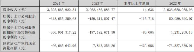 据公司2024年年报,报告期内,公司实现营业收入33.96亿元,同比增长14.63%;归属于上市公司股东的净利润-3.44亿元,2023年为-1.59亿元;扣除非经常性损益后的净利润-3.67亿元,2023年为-1.97亿元;经营活动产生的现金流量净额-2666.56万元。