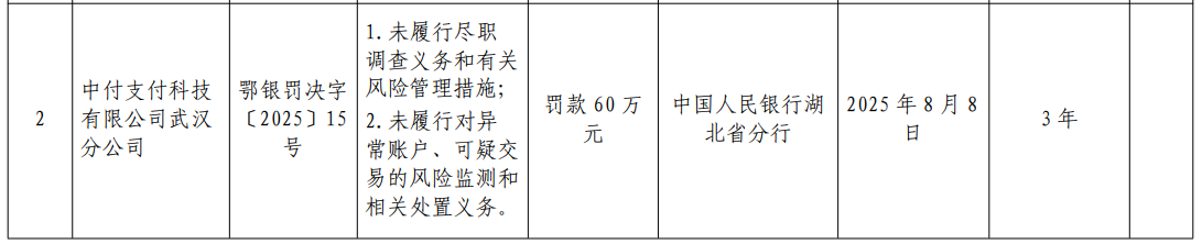 中国人民银行湖北省分行对中付支付科技有限公司武汉分公司处以罚款60万元。
