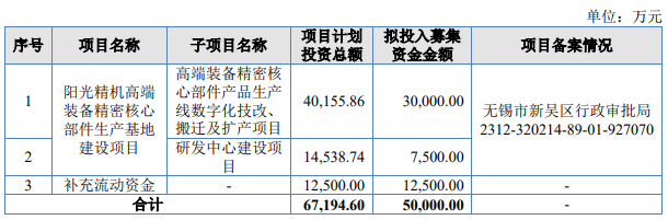 阳光精机原拟募集资金50000万元,计划用于阳光精机高端装备精密核心部件生产基地建设项目、补充流动资金。