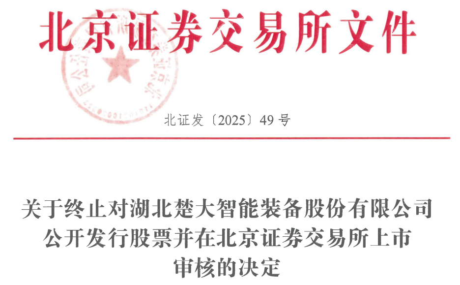 中国经济网北京8月19日讯 据北交所网站显示,北交所决定终止对湖北楚大智能装备股份有限公司(以下简称“楚大智能”)公开发行股票并在北交所上市审核。